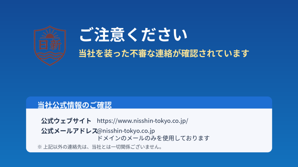 最近、当社を名乗る不審なメールの送信や、当社とは無関係のLINEグループへの招待、さらに当社代表取締役や当社スタッフを装った連絡が確認されております。
